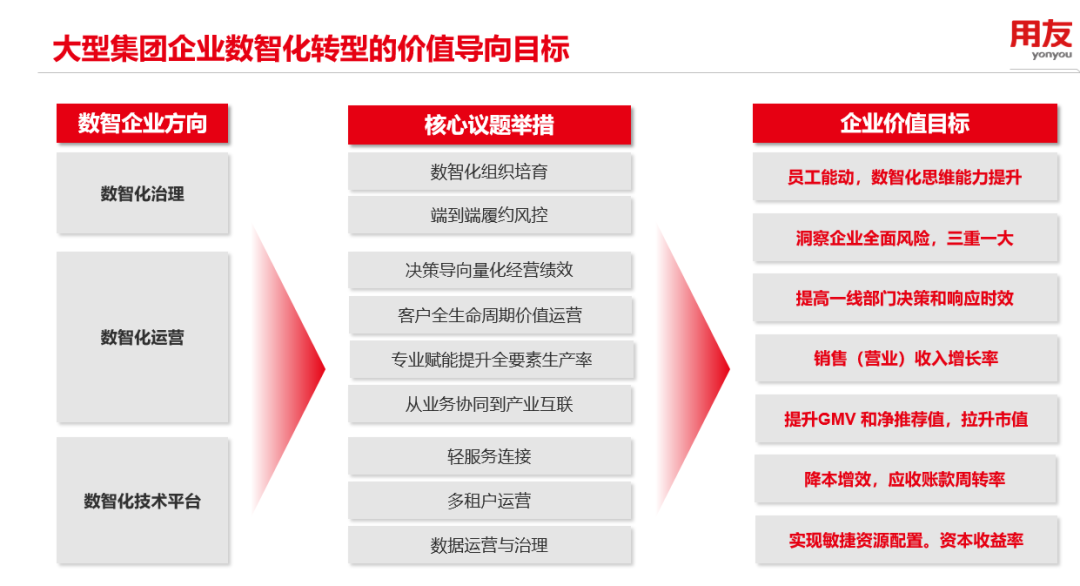 用友認為,大型企業(yè)在需求重塑、產業(yè)調整、政策升級等多重變革力量交織下,數(shù)智化轉型難度與日俱增。對于這項復雜而漫長的工作來說,明確價值導向將助推企業(yè)拾級而上。